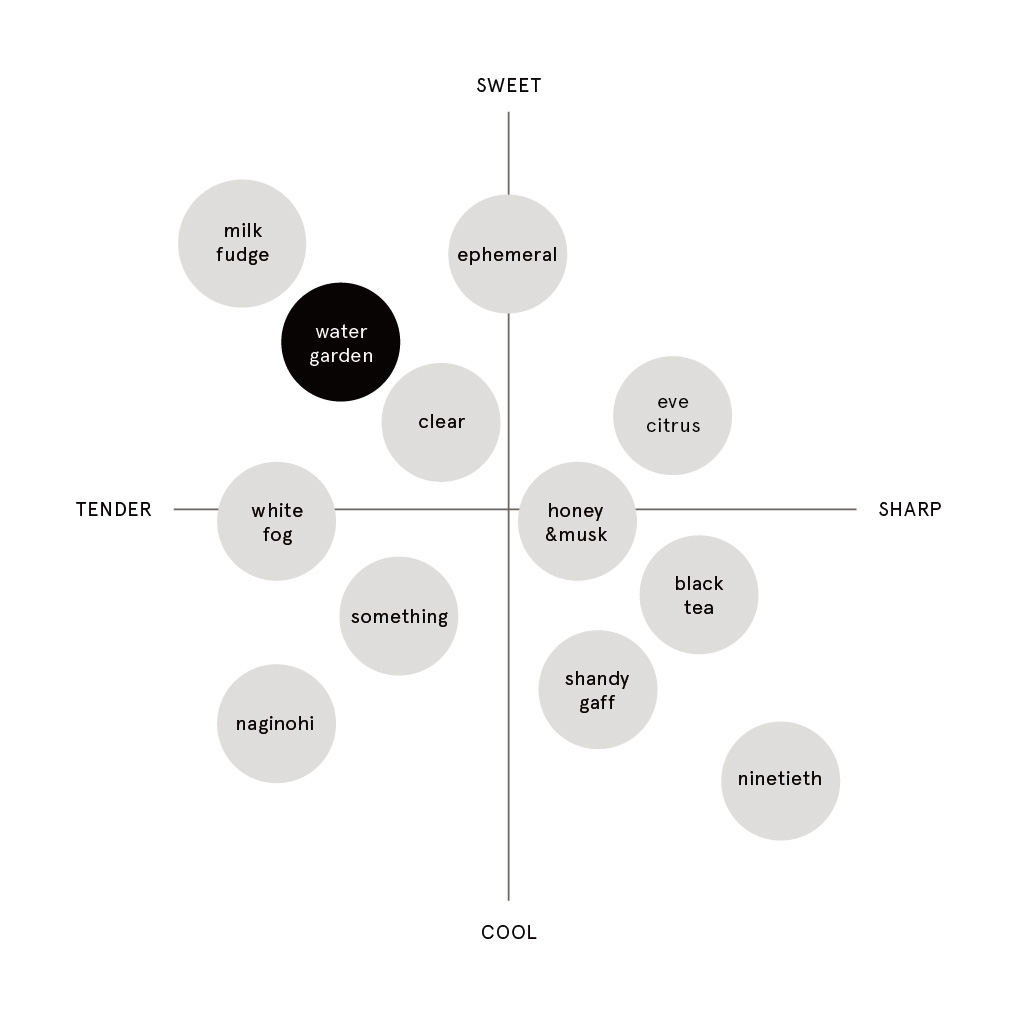 やわらかなフルーティとフローラルが絡み合い、水辺の空気のようにしっとりとした趣で、静けさと解放感のある魅惑的な香り。