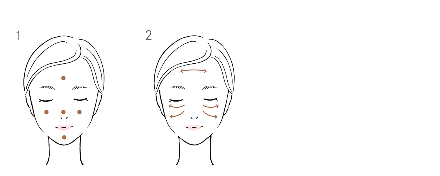 パール粒大をとり、両頬、額、鼻先、顎先にクリームをのせ、肌を軽く引き上げるようにやさしくなじませます。