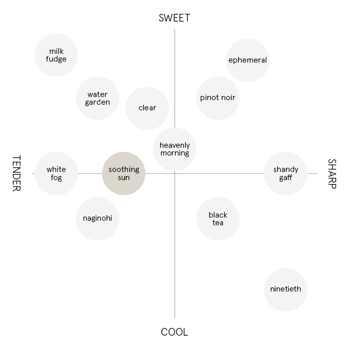 太陽のきらめきを水に映したようなみずみずしさとフレッシュさをまとうスージングサン。「癒しの太陽」の名の通り、心まで染まってしまいそうな太陽に身をまかせて香りの小旅行をお楽しみください。
