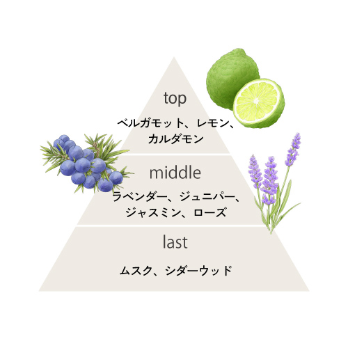 Top : ベルガモット、レモン、カルダモン Middle : ラベンダー、ジュニパー、ジャスミン、ローズ Last : ムスク、シダーウッド