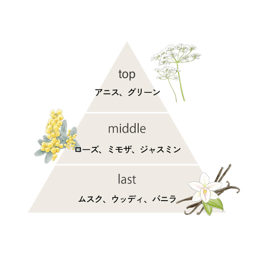 Top : アニス、グリーン Middle : ローズ、ミモザ、ジャスミン Last : ムスク、ウッディ、バニラ