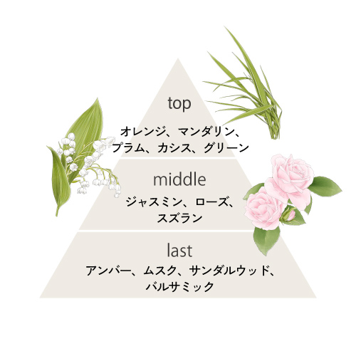 Top : オレンジ、マンダリン、プラム、カシス、グリーン Middle :ジャスミン、ローズ、スズラン Last :アンバー、ムスク、サンダルウッド、バルサミック