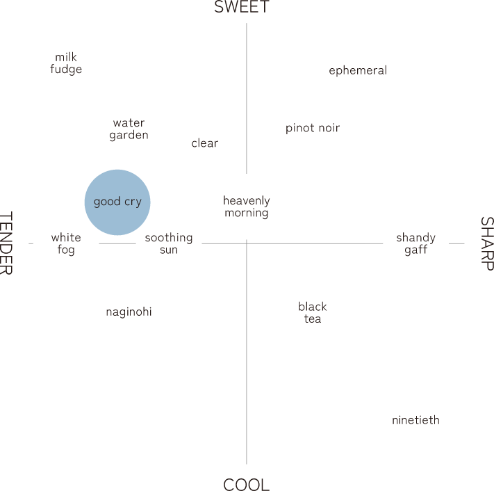 さわやかなフルーティさと、石けんを思わせる清潔感。広がるのは、どこまでも澄んだ透明な世界。晴れやかなフローラルに包まれた後は、ホワイトムスクやアンバーの温かな香りがそっと抱きしめる。