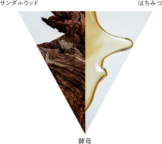 国産ハチミツとオーストラリア産オーガニックサンダルウッドを原料に、酵母によって生み出される発酵液です。自然の神秘のパワーを感じさせるトライアングル成分は、肌に深い潤いを与えます。