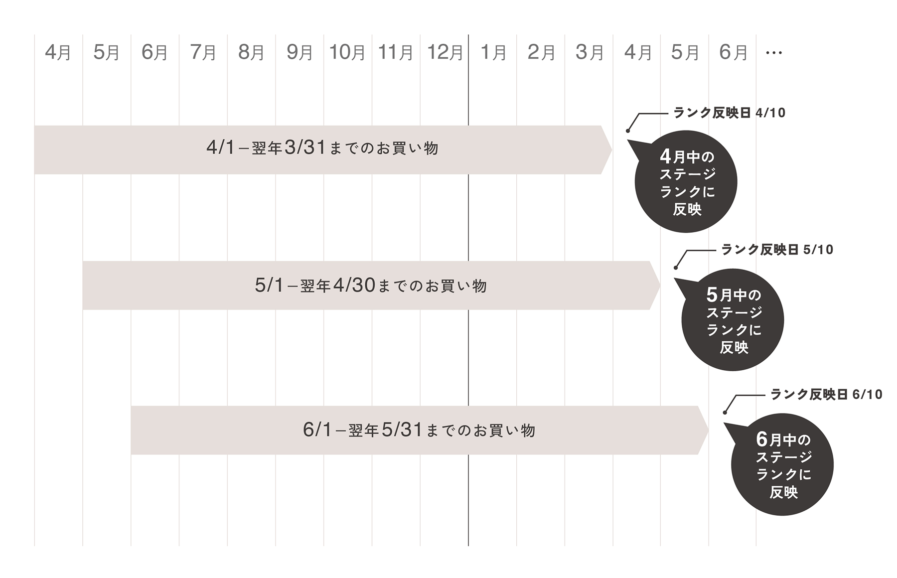 過去12ヶ月間(毎月31日締め)の「ご購入回数」と「累計購入金額(税込)」で翌月のステージランクが決まります。マイページのステージランクは、毎月10日10~13時頃に切り替わります。