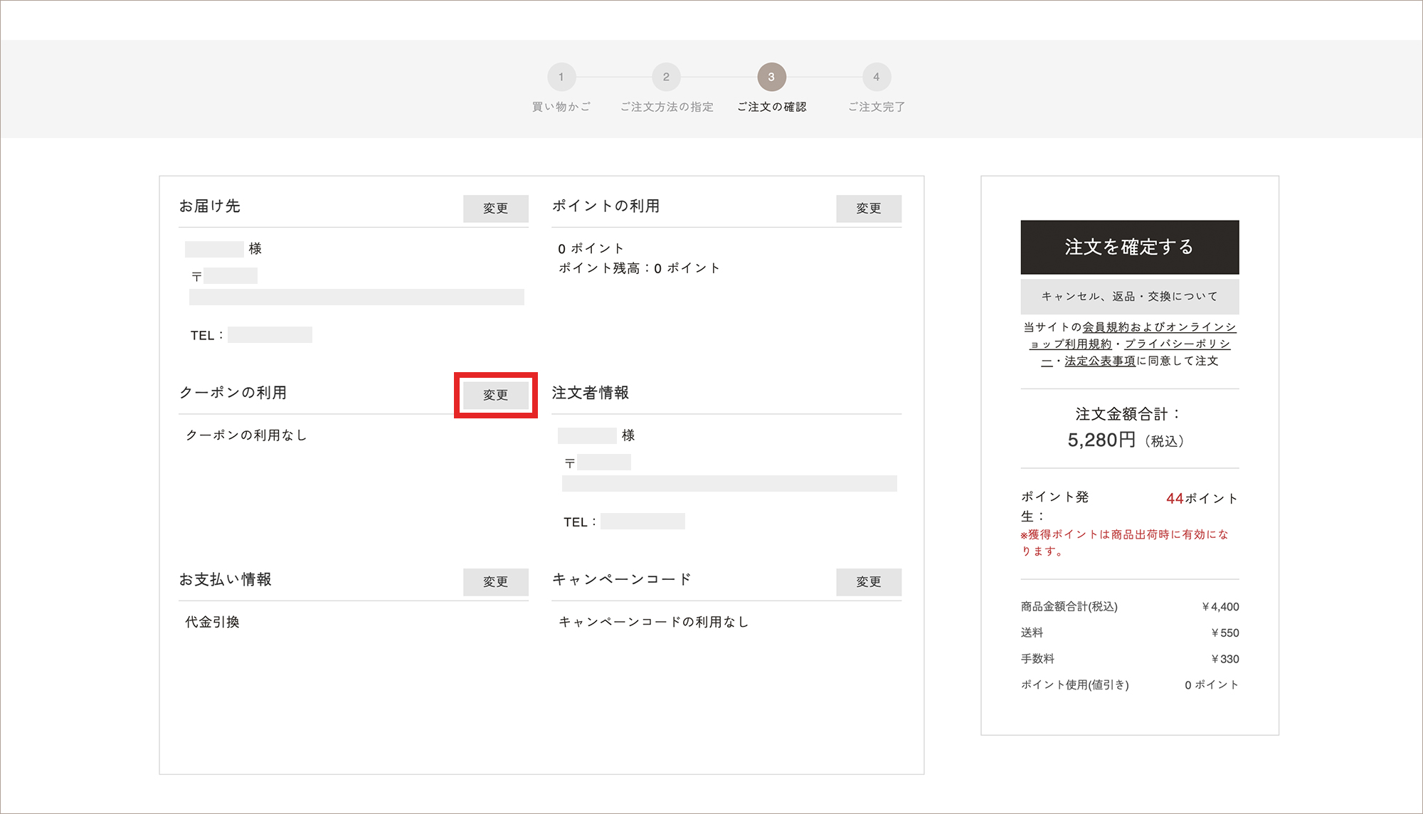 [ご注文の確認]画面にある、[クーポンの利用]の右側の「変更」ボタンを押します。