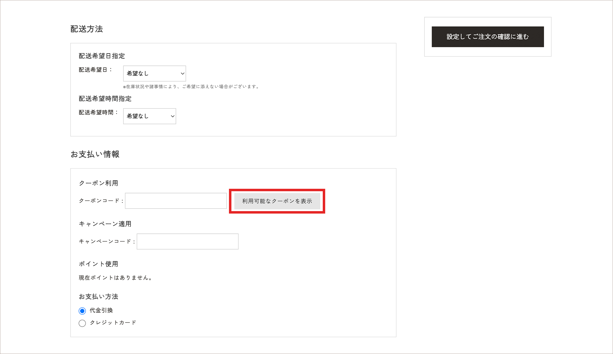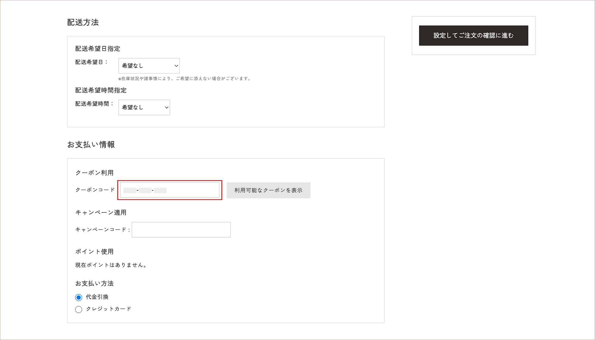 ②[お支払い情報]の[クーポン利用]部分にクーポンコードを入力し、ご注文の確認へ進んでください。