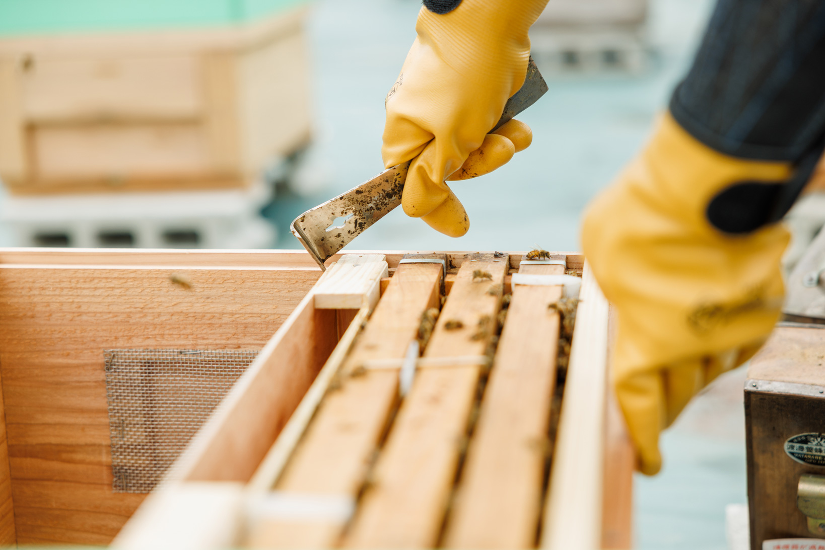 ミツバチのお世話は一群(箱)ごとに箱を開け、巣箱の中を確認してミツバチが快適に過ごせるようにメンテナンス。