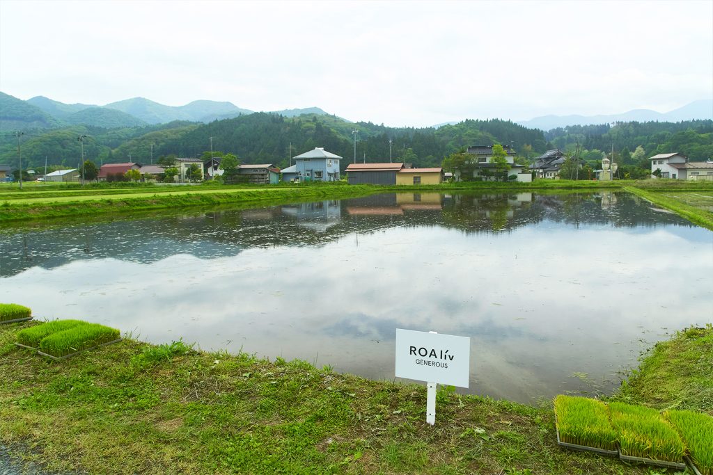 6月の初め、曇り空で田植え作業にはありがたい天気でした。田んぼに到着して、最初の作業はROAlivの看板を立てることから!ここでジェネラスのお米が育つのだと実感が湧き、すでに感無量です。