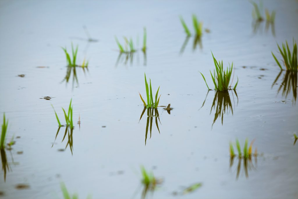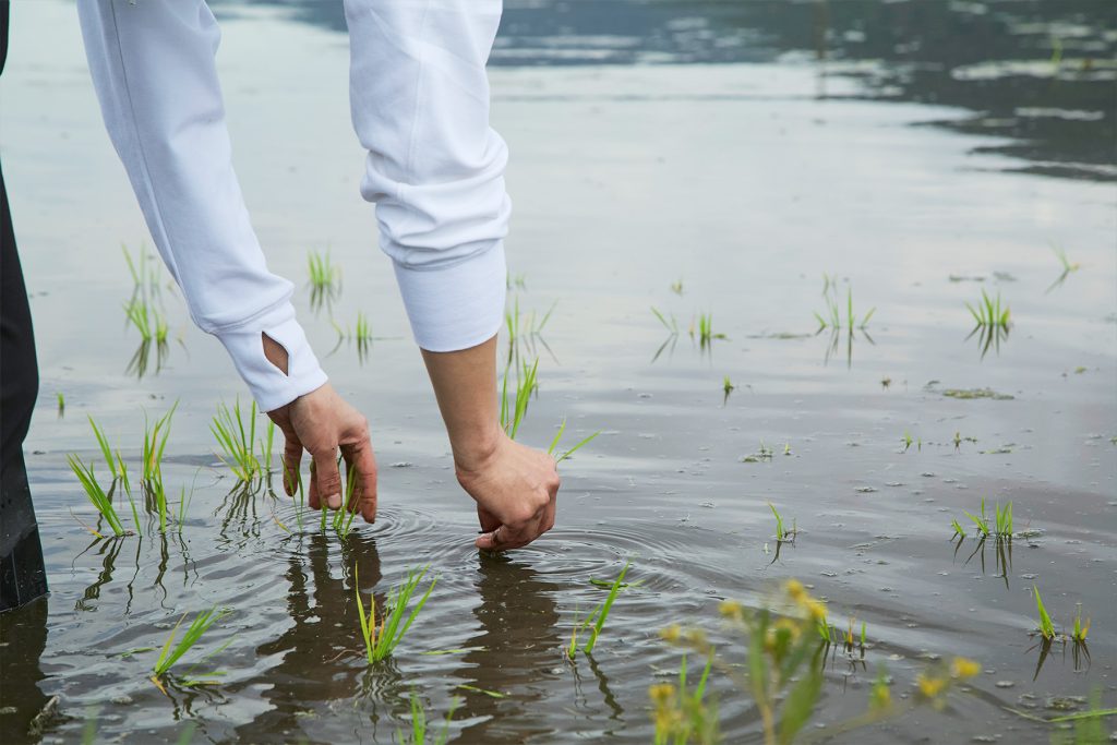 暖かい水の中で土のパワーを感じながら、一つずつ小さな稲を植えるのですが、等間隔に整列させながら植えるのはなかなか難しく、私たちが植えている場所は少々おおらかな出来栄えですが、無事に育つようにと黙々と作業を続けていきます。現在のお米問題を考えると、この田んぼのお米が無事に育ち、収穫されることが何よりの願いです。